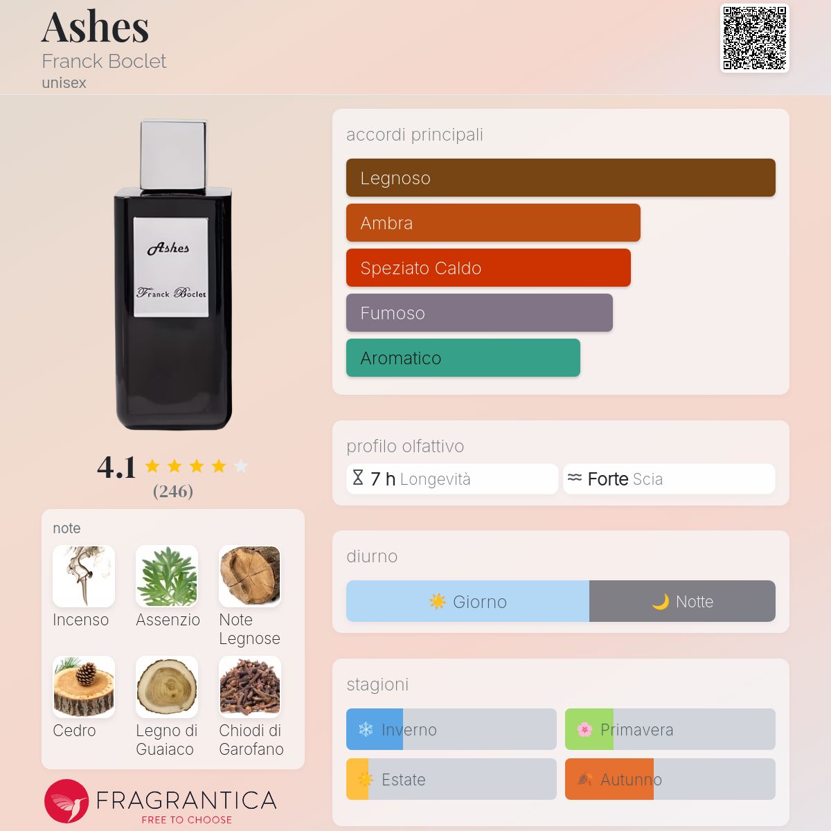 Ashes di Franck Boclet è una fragranza del gruppo Aromatic Spicy unisex. Ashes è stato lanciato sul mercato nel 2016. Le note di testa sono Assenzio Romano e Chiodi di Garofano; le note di cuore sono Cedro dell'Atlante, Cedro della Virginia, Legno di Guaiaco e Patchouli; le note di base sono Incenso, Note Legnose, Ambra e Muschio.